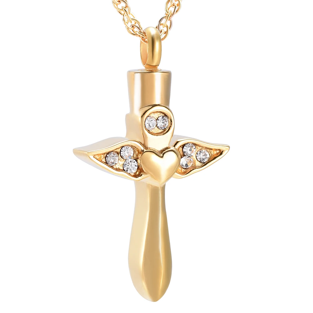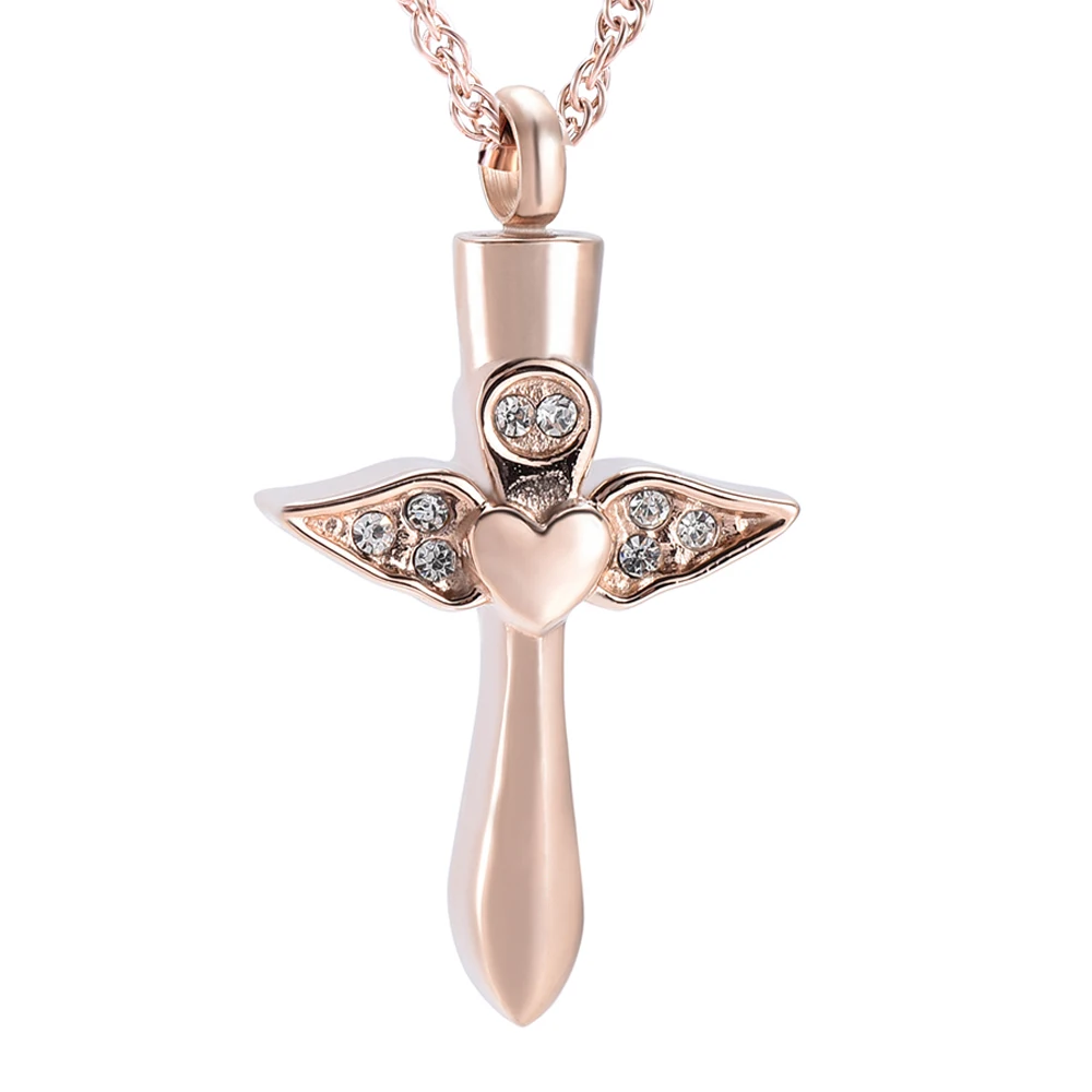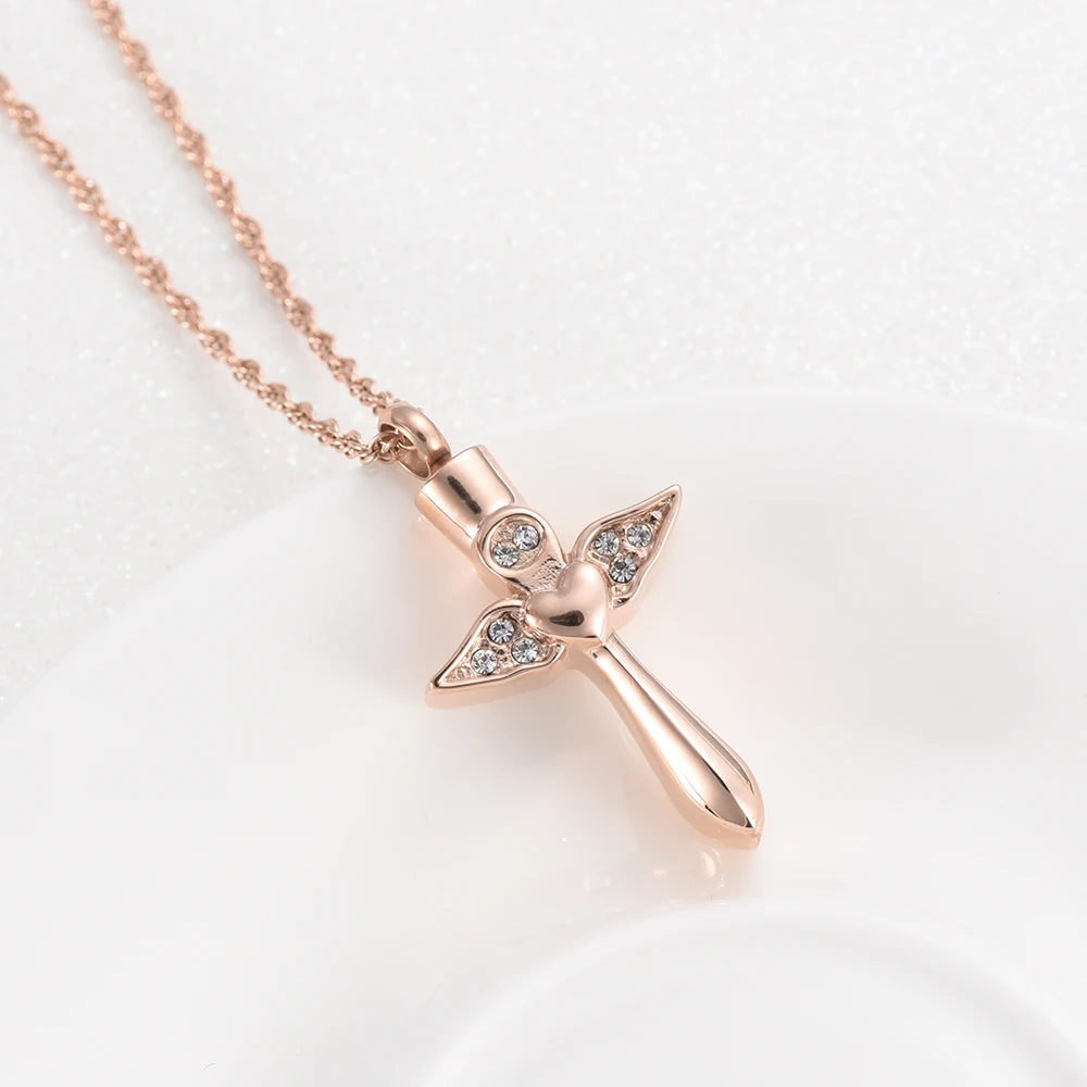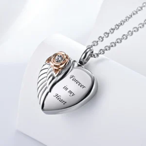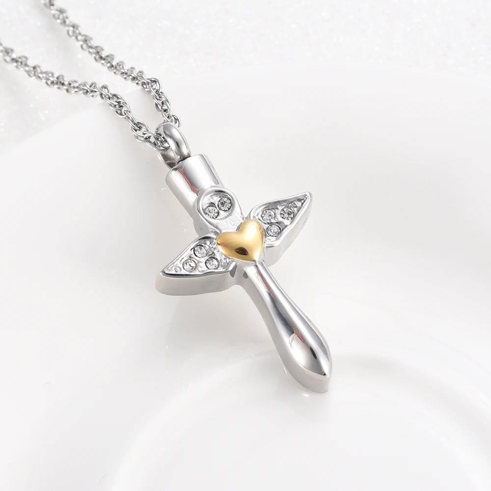 Constructed from robust stainless steel, this heart-shaped cross urn necklace is embellished with radiant cubic zirconia and includes a fashionable chain. It serves as a lasting and graceful keepsake to commemorate and pay tribute to a cherished loved one.