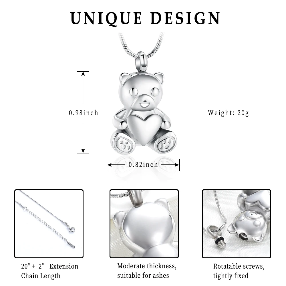 This teddy bear cremation jewelry is a meaningful tribute for honoring a child, infant, or loved one who brought warmth and joy into your life.